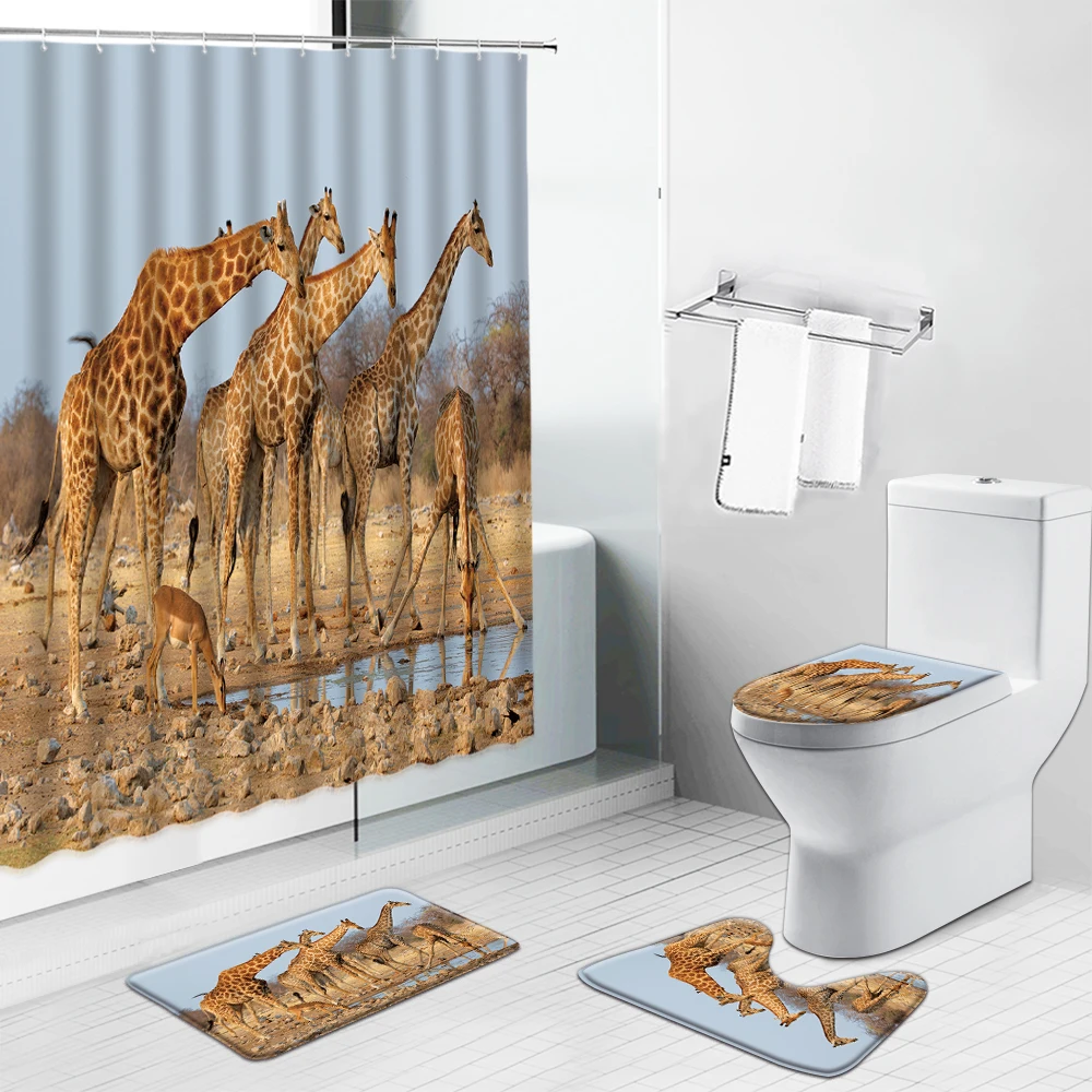 Special Offer Afrika Dier Giraffe Douchegordijn Tijger Olifant Zebra Non Slip Tapijten Wc Deksel Cover Tapijt Mat Cartoon Badkamer Gordijn Set Discount (49%OFF) Today!