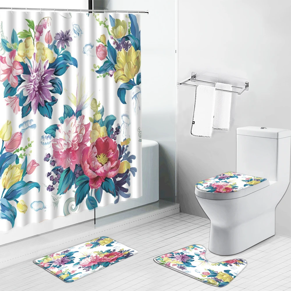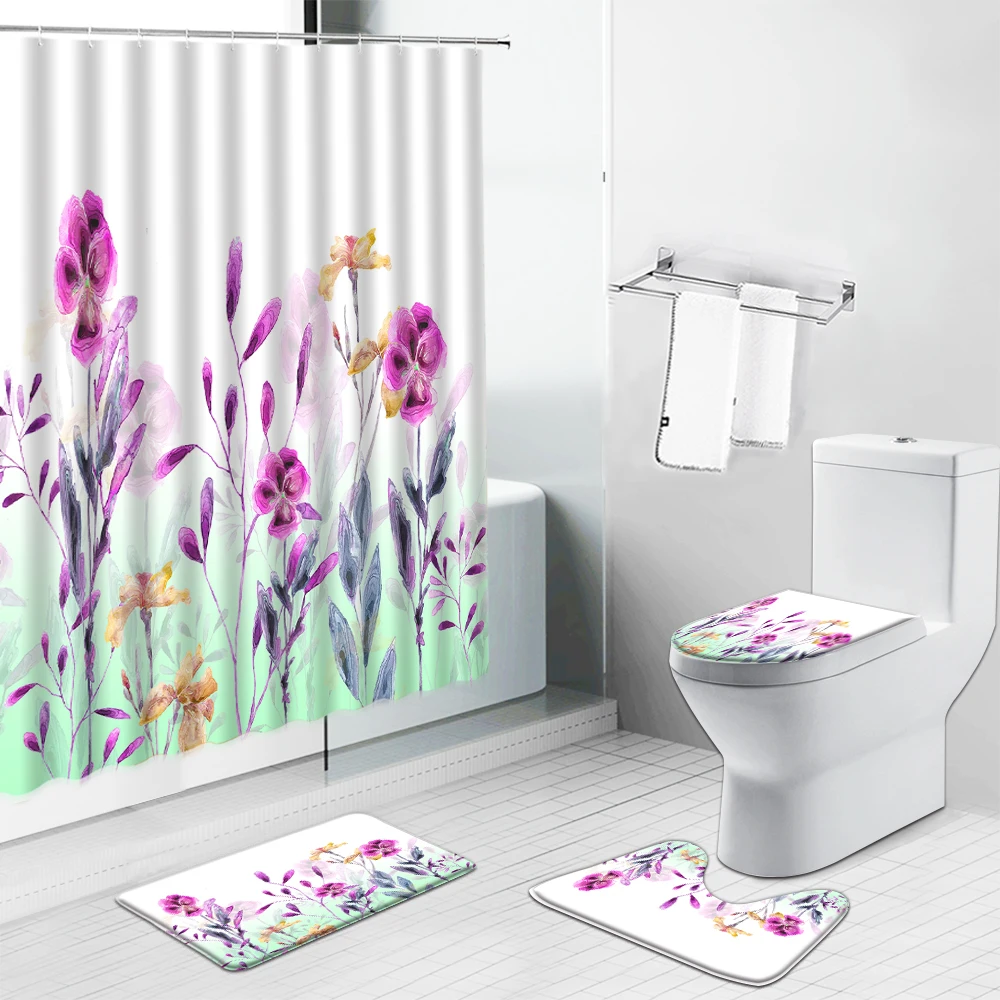 Product Name: Paarse Bloem Douchegordijnen Bad Mat Antislip Rug Aquarel Bloemen Tapijt Bad Wc Scherm Badkamer Decor Set Met Haken